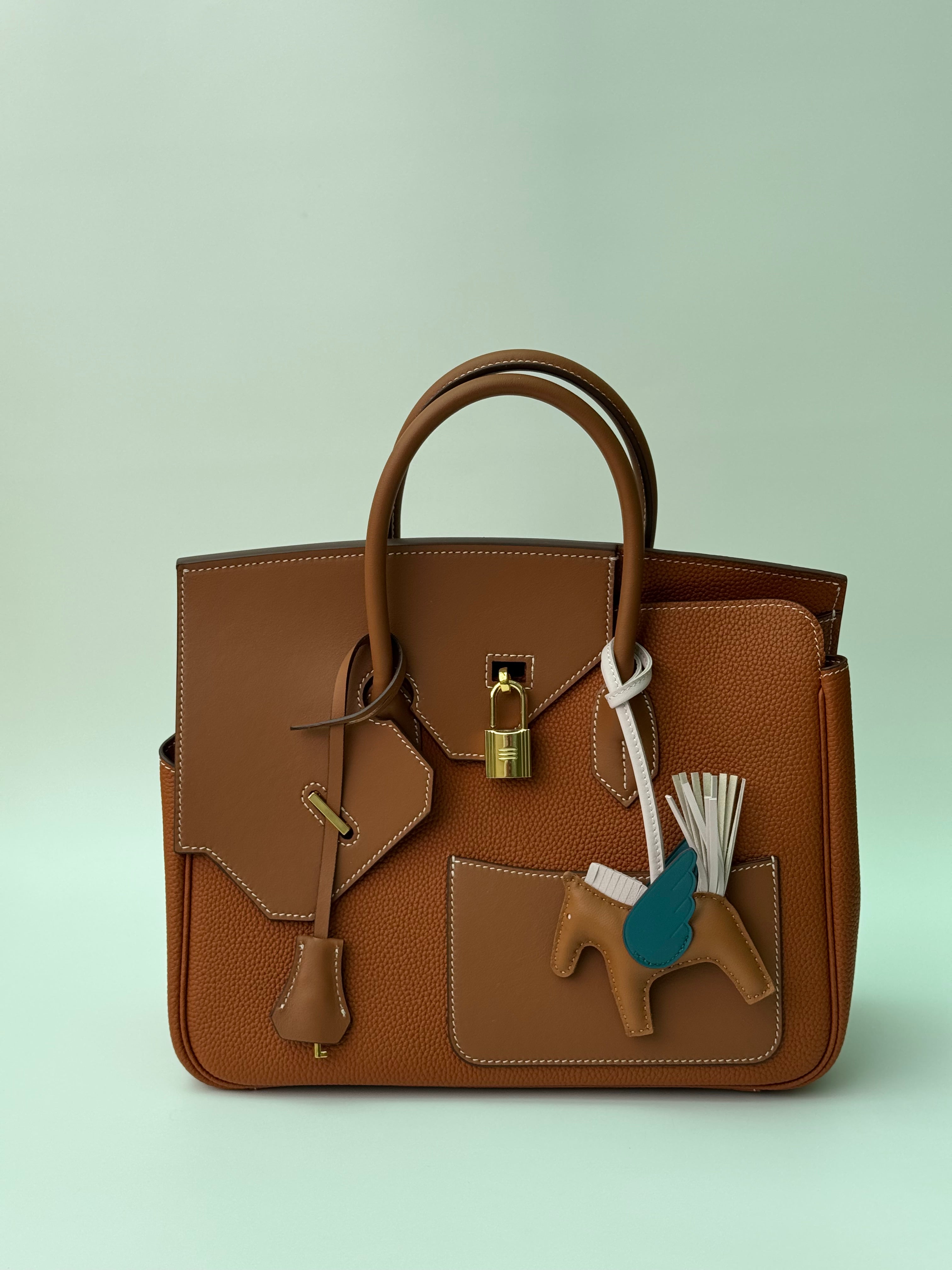 - Exterior: Front pocket; diagonal zip pocket at back; half-diagonal front flap with toggle closure; clochette with lock & key